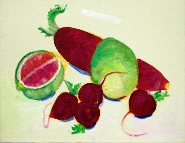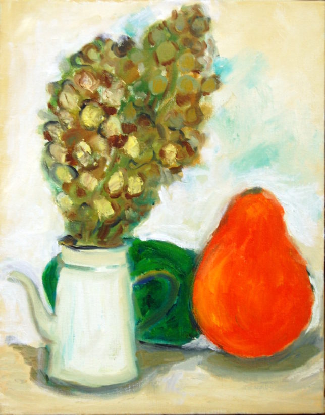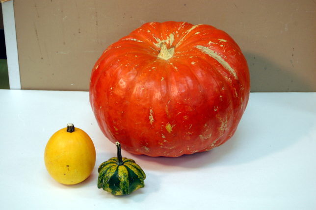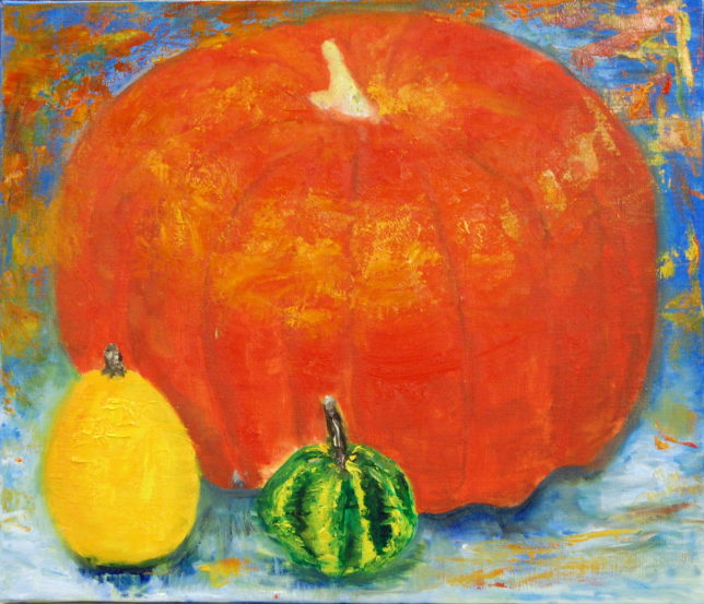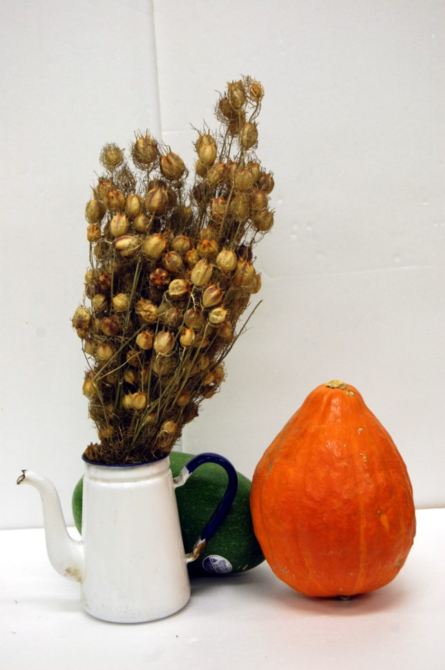 12月4日の教室から: カボチャ、野菜、カラスウリ、ポットとビン